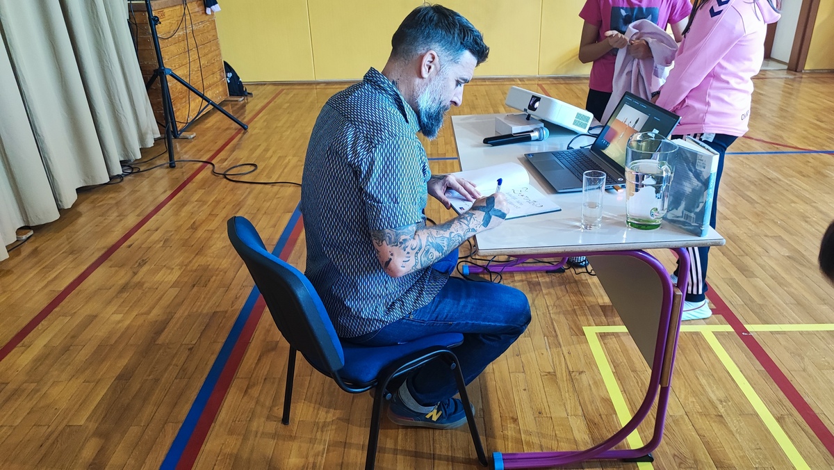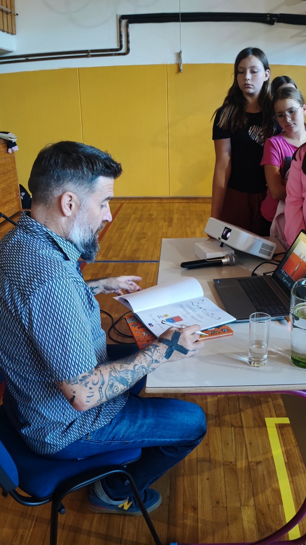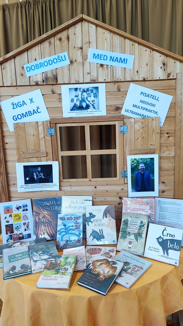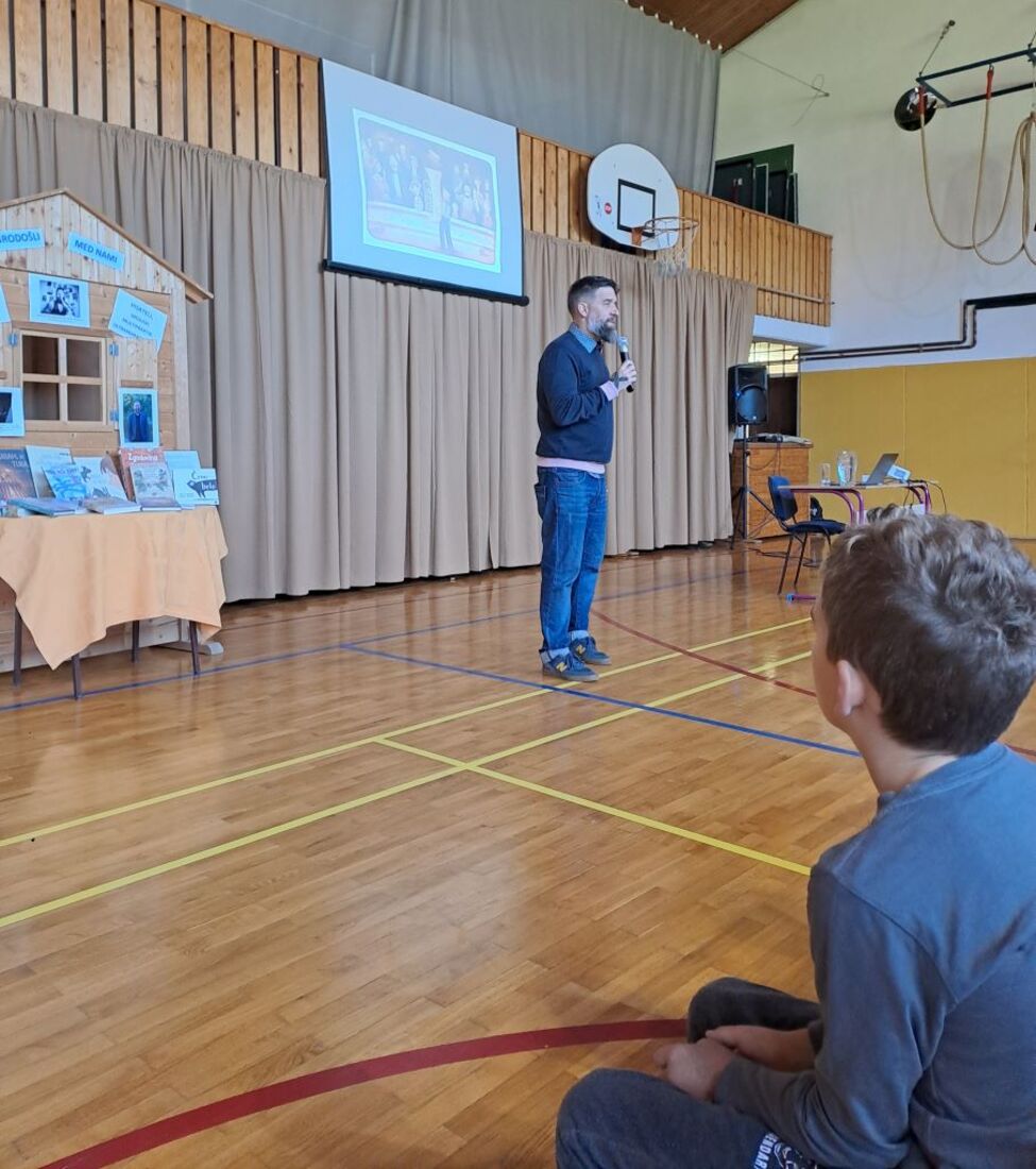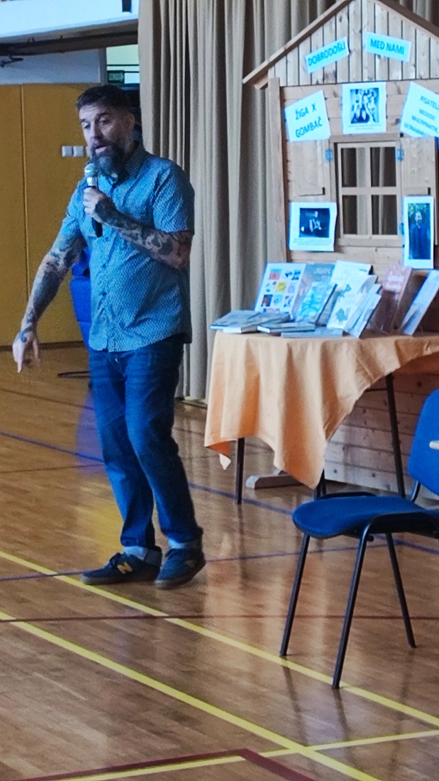 Žiga X Gombač, znan po številnih uspešnicah za otroke in mladino, kot so Adam in tuba, Črno belo, Lumpsterji ter serija Živa, je učence skozi nastop popeljal v zakulisje svojega ustvarjalnega sveta. Pisatelj, ki je hkrati tudi medijski ustvarjalec in ultramaratonec, je z mladimi delil svoje življenjsko geslo, s čimer je poudaril pomen odkrivanja in sledenja osebnim strastem, ne glede na to, kaj pričakujejo drugi. Razkril je še, kje črpa navdih za svoje zgodbe – pogosto so to dogodivščine iz njegovega otroštva ali izzivi, s katerimi se srečujejo otroci ali sam.