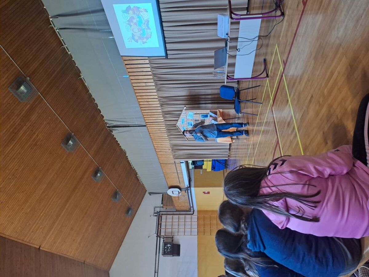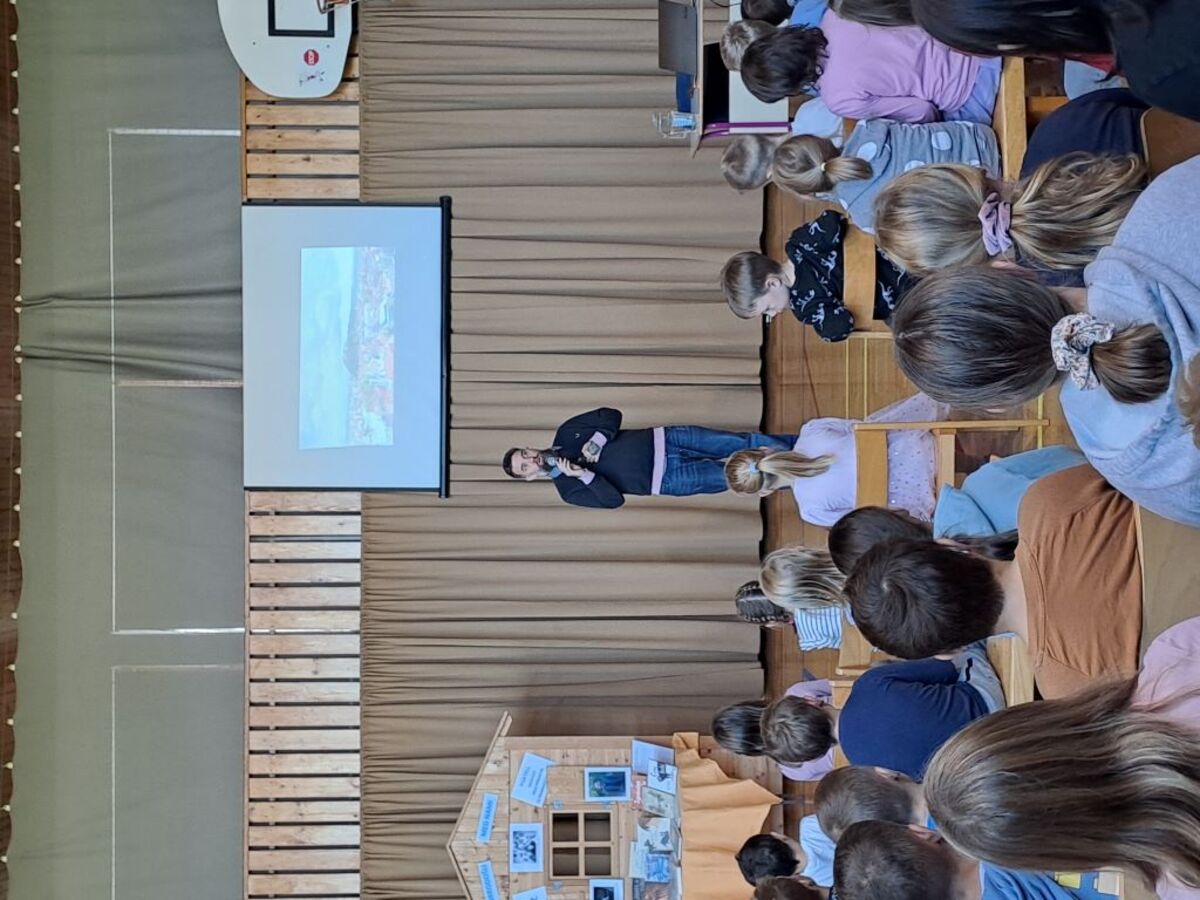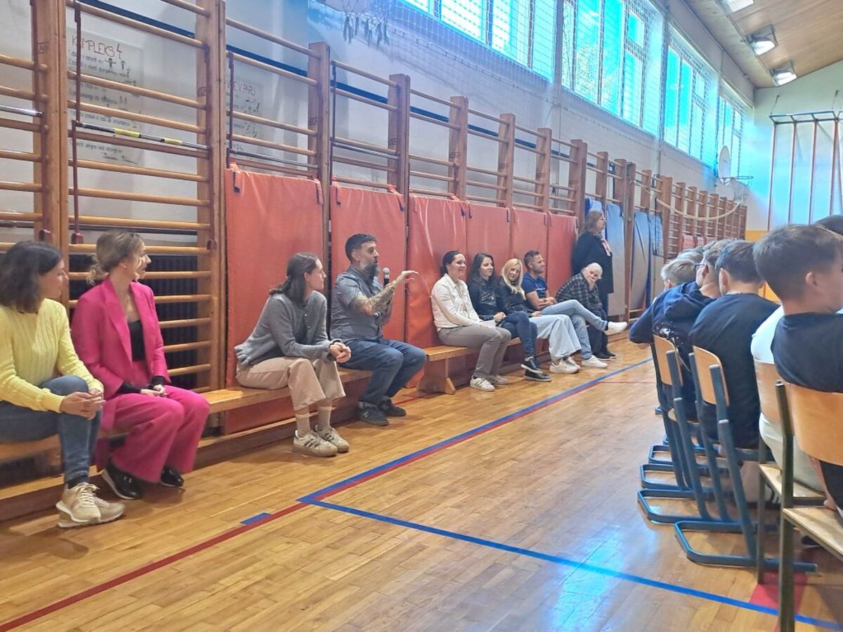 Žiga X Gombač, znan po številnih uspešnicah za otroke in mladino, kot so Adam in tuba, Črno belo, Lumpsterji ter serija Živa, je učence skozi nastop popeljal v zakulisje svojega ustvarjalnega sveta. Pisatelj, ki je hkrati tudi medijski ustvarjalec in ultramaratonec, je z mladimi delil svoje življenjsko geslo, s čimer je poudaril pomen odkrivanja in sledenja osebnim strastem, ne glede na to, kaj pričakujejo drugi. Razkril je še, kje črpa navdih za svoje zgodbe – pogosto so to dogodivščine iz njegovega otroštva ali izzivi, s katerimi se srečujejo otroci ali sam.