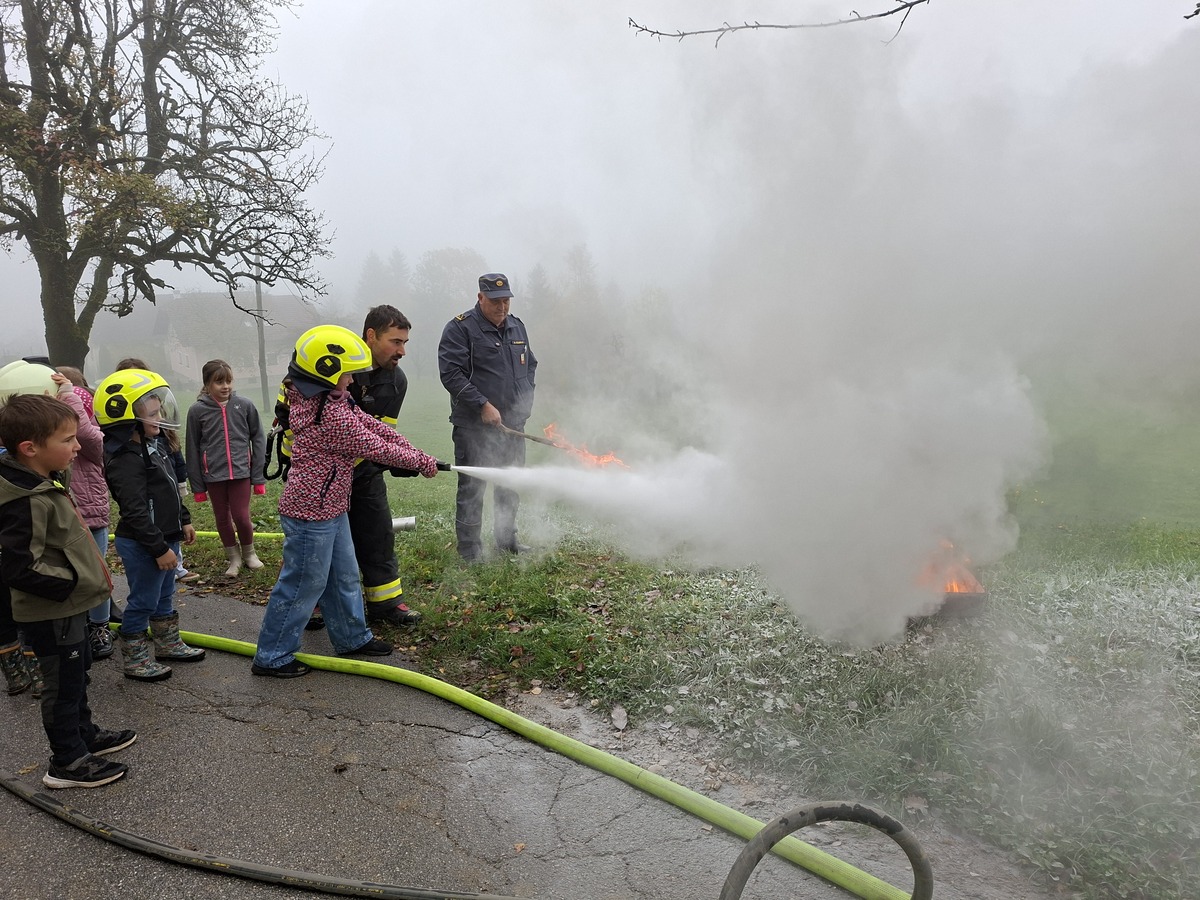 Po uspešno izvedeni vaji so nam gasilci in gasilka PGD Nova Štifta pripravili zanimivo in poučno predstavitev svojega dela. Razkazali so gasilske tovornjake, prikazali gašenje z vodo in gasilnim aparatom, učenci pa so se lahko tudi sami preizkusili v gašenju.