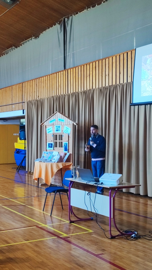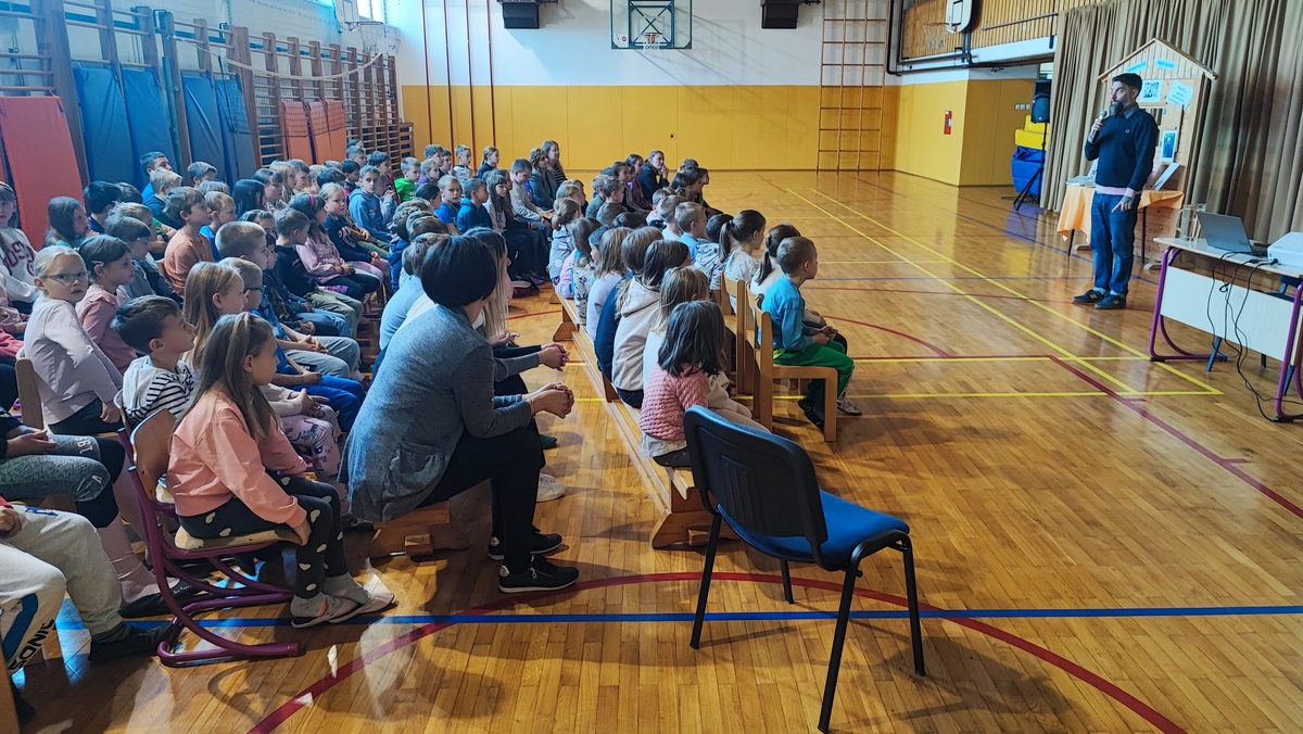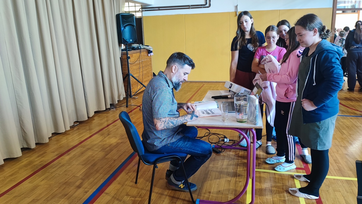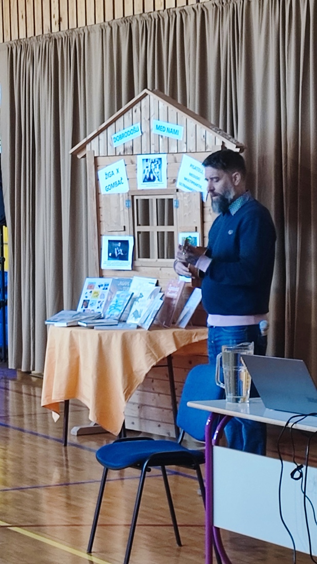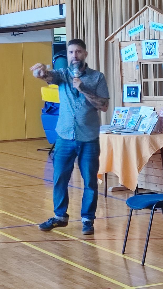 Žiga X Gombač, znan po številnih uspešnicah za otroke in mladino, kot so Adam in tuba, Črno belo, Lumpsterji ter serija Živa, je učence skozi nastop popeljal v zakulisje svojega ustvarjalnega sveta. Pisatelj, ki je hkrati tudi medijski ustvarjalec in ultramaratonec, je z mladimi delil svoje življenjsko geslo, s čimer je poudaril pomen odkrivanja in sledenja osebnim strastem, ne glede na to, kaj pričakujejo drugi. Razkril je še, kje črpa navdih za svoje zgodbe – pogosto so to dogodivščine iz njegovega otroštva ali izzivi, s katerimi se srečujejo otroci ali sam.