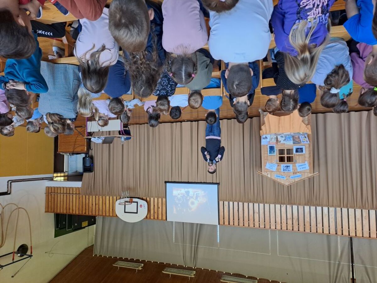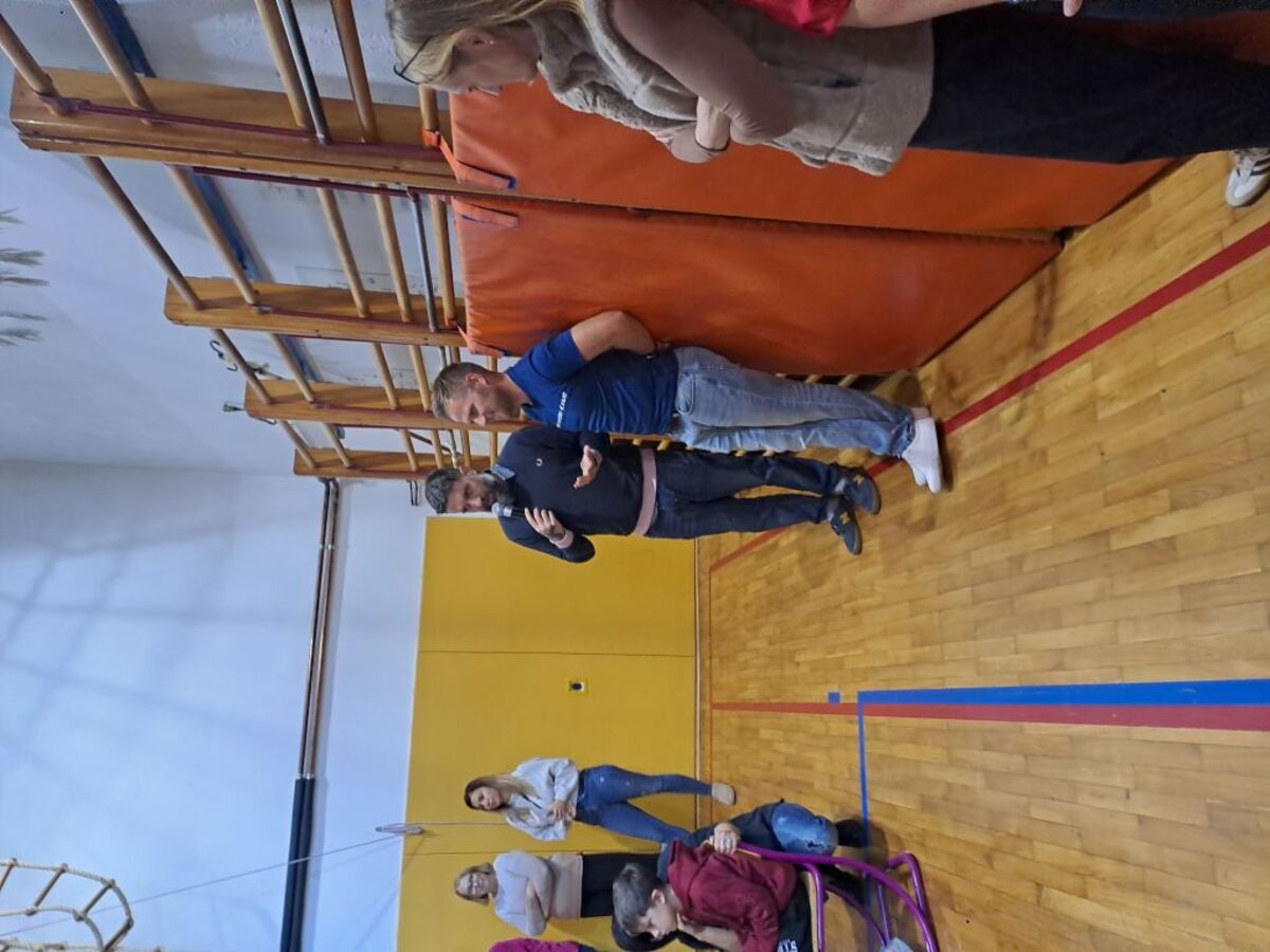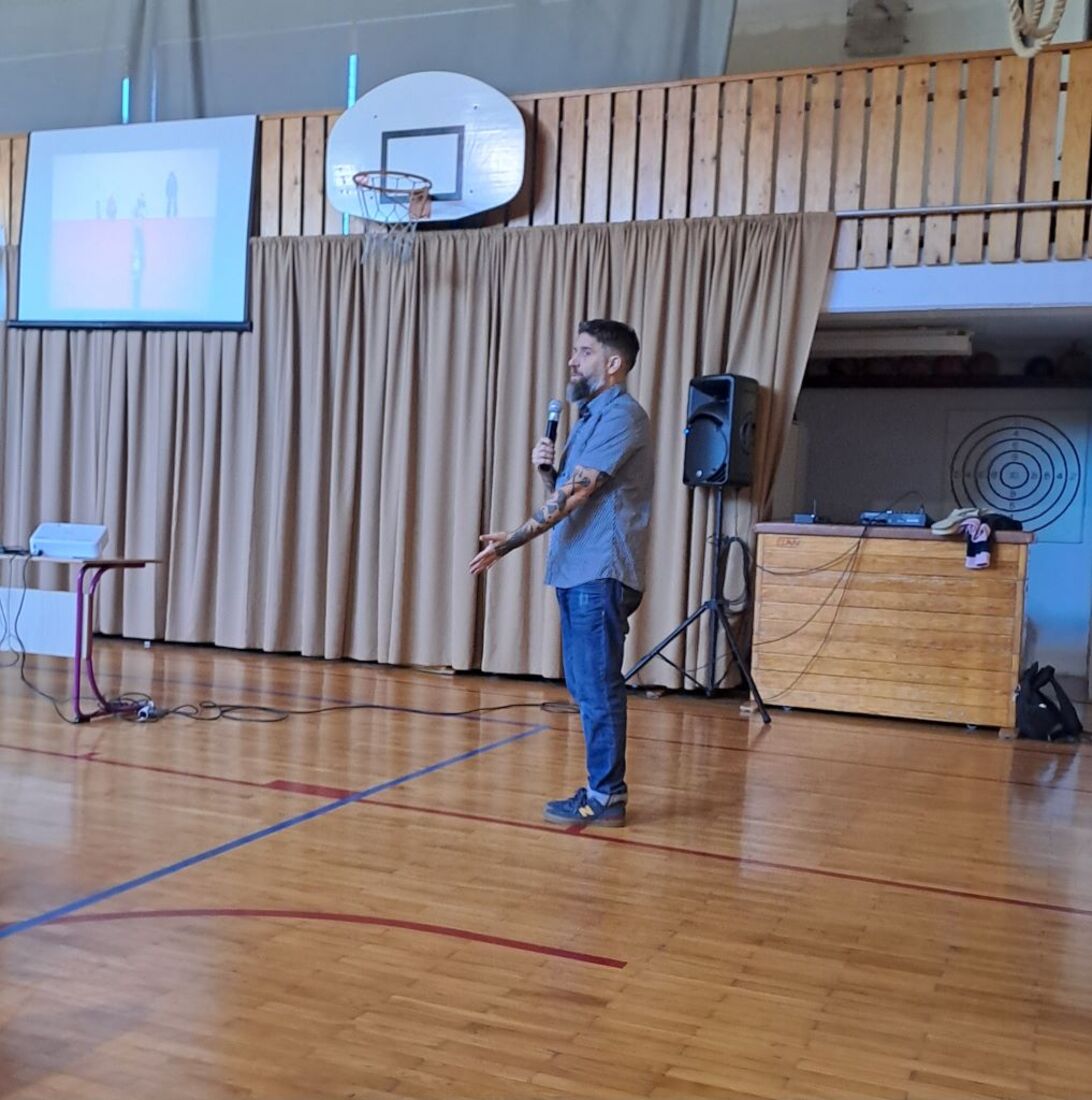 Žiga X Gombač, znan po številnih uspešnicah za otroke in mladino, kot so Adam in tuba, Črno belo, Lumpsterji ter serija Živa, je učence skozi nastop popeljal v zakulisje svojega ustvarjalnega sveta. Pisatelj, ki je hkrati tudi medijski ustvarjalec in ultramaratonec, je z mladimi delil svoje življenjsko geslo, s čimer je poudaril pomen odkrivanja in sledenja osebnim strastem, ne glede na to, kaj pričakujejo drugi. Razkril je še, kje črpa navdih za svoje zgodbe – pogosto so to dogodivščine iz njegovega otroštva ali izzivi, s katerimi se srečujejo otroci ali sam.
